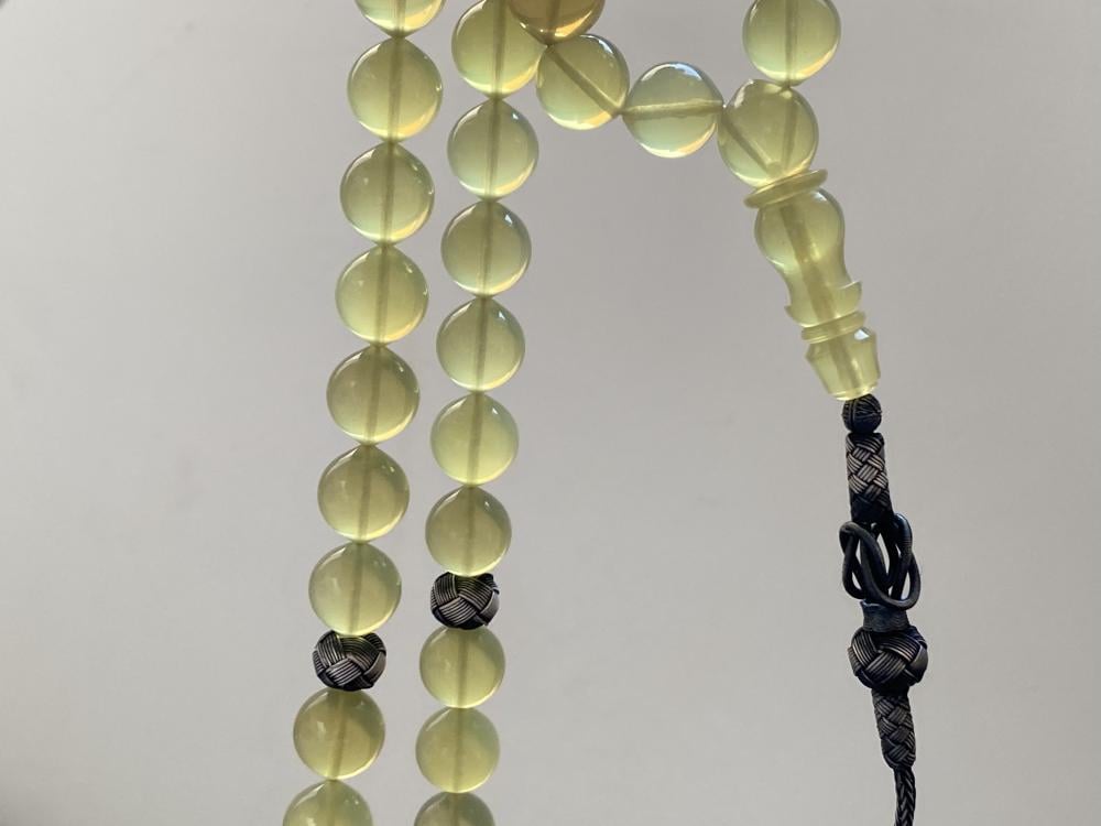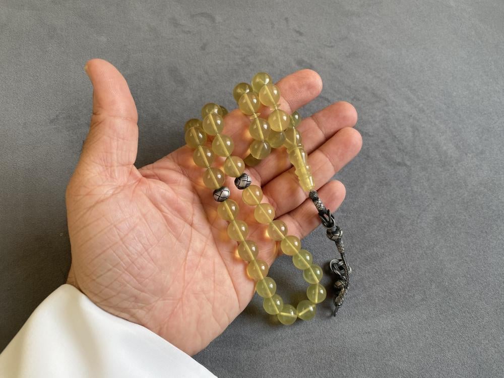 سبحة أنيقة مصنوعة من خامة القلاليث المميزة بلون أصفر زيتي (مائل للخُضرة) وشفافية نادرة تخطف الأنظار.