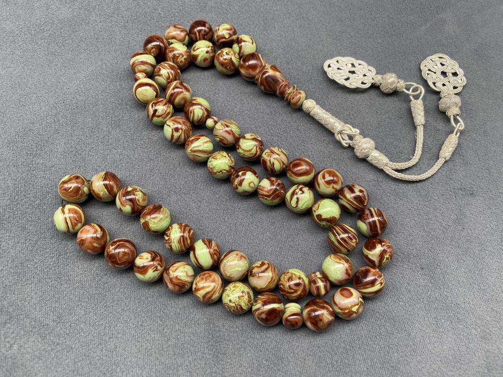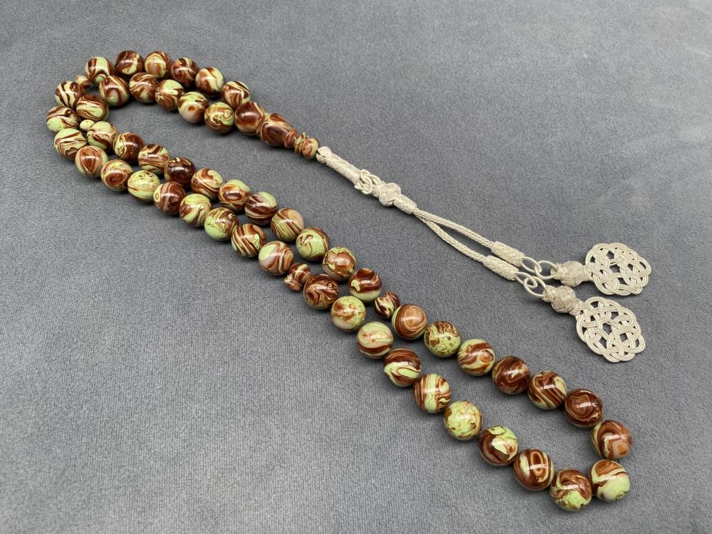 السبحة صنعت يدوياً من خامة الفاتوران المميزة بتمازج رائع بين اللونين الأخضر و البني ، كما تمتاز بطول و وزن يجعلها حاضرة و ملفته في يدك كما و زينت بطرابزونه فضة لتضيف لمسة فخامة لهذه القطعة الفنية الفريدة.